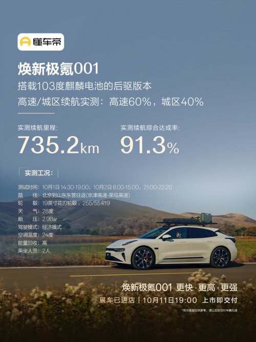 懂车帝测试:续航实测735.2km,续航综合达成率91.3%