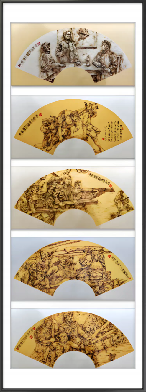 虾画雅趣技追先贤,丹青理想是为超越。如果说虾画是徐志敏得益于大师教化的写意大成,那么他的铁笔烙画与炭精肖像画,则又是中华传统非遗技艺传承之一绝,包括江南海派古意山水扇面作品,均充分体现了他工笔原技深刻的印证。徐志敏传统技法超能细致,用尽千万之笔,无一笔之误错,都是一丝不苟,精益致深的非凡创作。建党百年庆典活动的《高举马列主义毛泽东思想的伟大旗帜奋勇前进》月份牌炭精肖像画、工笔铁烙《开国大典》、《周恩来会见刘英》、《虎啸雷鸣》作品能成大气势,并不仅是一笔一笔细致构绘的结果,关键之因是徐志敏内心涌动着超越前人的艺术雄心。传承之技,也是心胜进取的理想呈现。