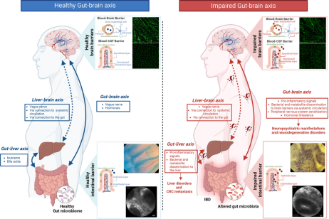 △图注:左图展示健康状态下,肠道与大脑的保护屏障完整,两者通过神经和体液正常沟通。右图显示发生炎症性肠病时,肠道屏障受损,有害物质进入血液,引发全身炎症,并波及大脑、破坏其保护屏障,最终增加神经系统疾病、肝病及结直肠癌转移风险。