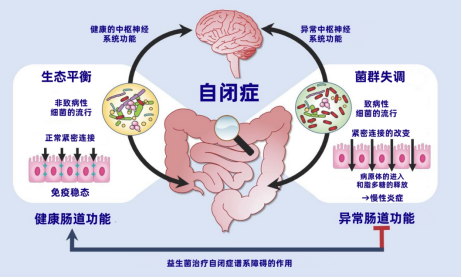 许多ASD儿童常伴有胃肠道症状。研究显示,相当比例的ASD患者存在肠道屏障功能受损(肠漏)。其潜在影响路径可概括为:肠道菌群失调 → 肠漏 → 有害物质入血引发全身炎症 → 炎症削弱血脑屏障 → 神经炎症干扰大脑发育 → 与ASD部分症状相关