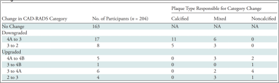图示:25名患者(16例源于钙化斑块,9例源于混合斑块)被重新分类至更低的CAD-RADS分级;16名患者(8例源于非钙化斑块,8例源于混合斑块)被划分至更高的CAD-RADS分级。