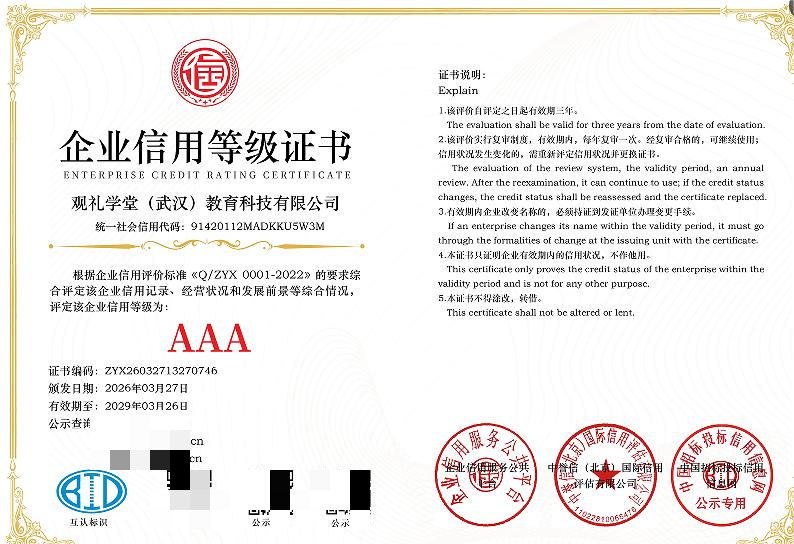 近日,经权威信用评级机构严格审核与综合评估,观礼学堂(武汉)教育科技有限公司凭借良好的企业信誉、规范的运营管理及优质的客户服务,成功荣获“AAA级企业信用等级”证书。